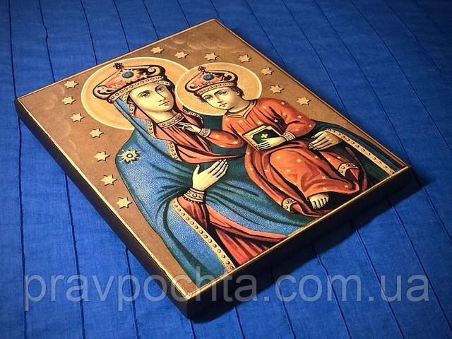 Ікона Богородиці Озерянська. Високоякісний друк, шпонки, ковчег, поліграфія, фарба, лак в 2 шари. Розмір: 220 х 180 х 18 мм. Вага: гр.