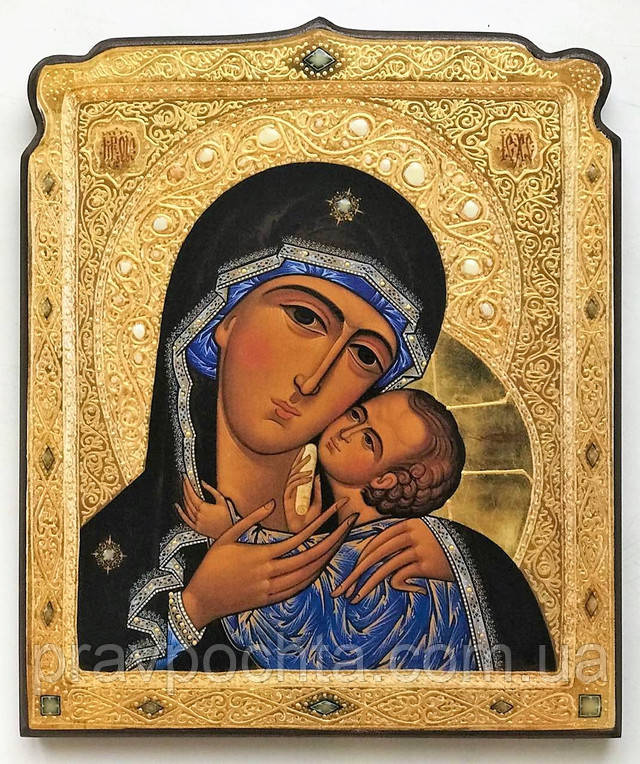 "Касперівська" ікона Божої Матері з декоративним розписом (С.Вандаловський). Ікона на дошці, фігурна, шпон (ясен), шпонки, поліграфія, декоративна облямівка та каміння, фарба, лак. Розмір: 260 х 200 х 18 мм. Вага: 750 гр.