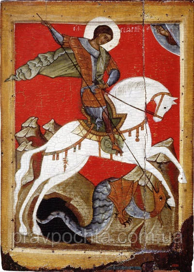 На іконах великомученик Георгій зображується сидячою на білому коні і що вражає списом змія. Це зображення засноване на переказі і відноситься до посмертним чудес святого великомученика Георгія. Розповідають, що недалеко від місця, де народився святий Георгій в місті Бейруті, в озері жив змій, який часто пожирав людей тієї місцевості. Що це був за звір – удав, крокодил чи велика ящірка – невідомо.