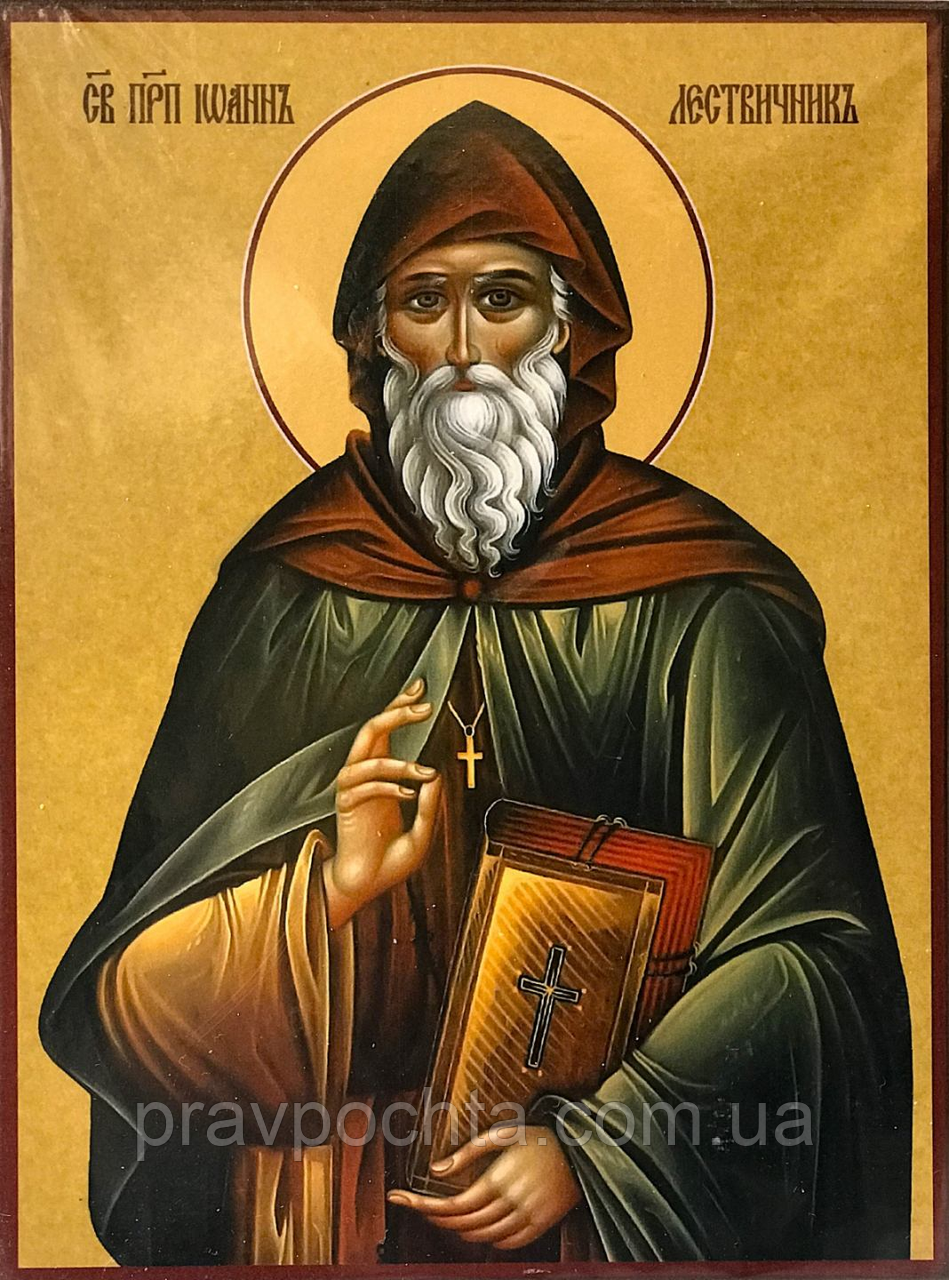 Преп. Іоан Лествичник. Ікона на дошці, шпон (ясен), шпонки, поліграфія, фарби, лак. Розмір: 200 х 150 х 18 мм. Вага: гр.