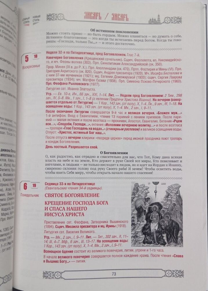 У календарі вказуються Євангельські та Апостольські читання щодня, тропарі та кондаки на кожен день, зручий календарь для використання на кліросі.