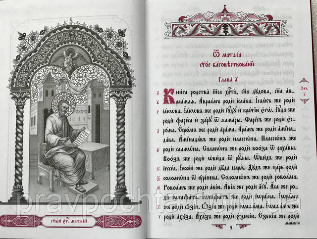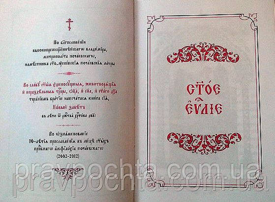 Новий Завіт на церковно-слов'янською мовою, з зачалами, для щоденного читання на богослужінні і вдома. Видавництво: Почаївська Лавра, 2012 р. 824 стор. Обкладинка тверда, папір білий, великий шрифт, двоколірний друк. Розмір: 215 x 150 x 40 мм. Вага: 1038 гр.